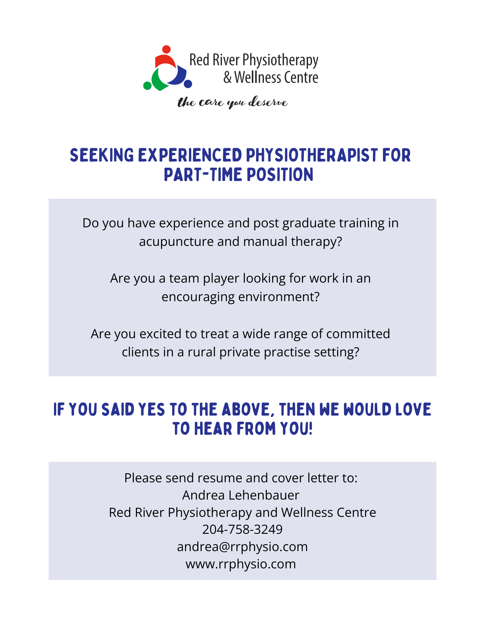 Red River Physiotherapy & Wellness Centre is seeking an experienced Part-Time Physiotherapist.
